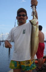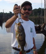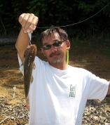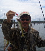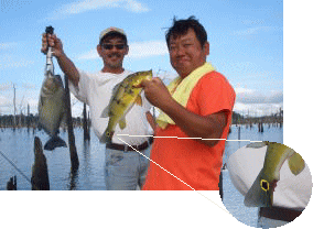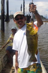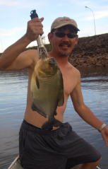 いっしょに行った大内さん、とっても大きなツクナレ釣ったんです、悔しいから写真は載りません、でも小さいのはこの通り。 大内さんに釣られたツクナレのシッポを咬みに来たところを僕に釣られた間抜けなピラニア。 |